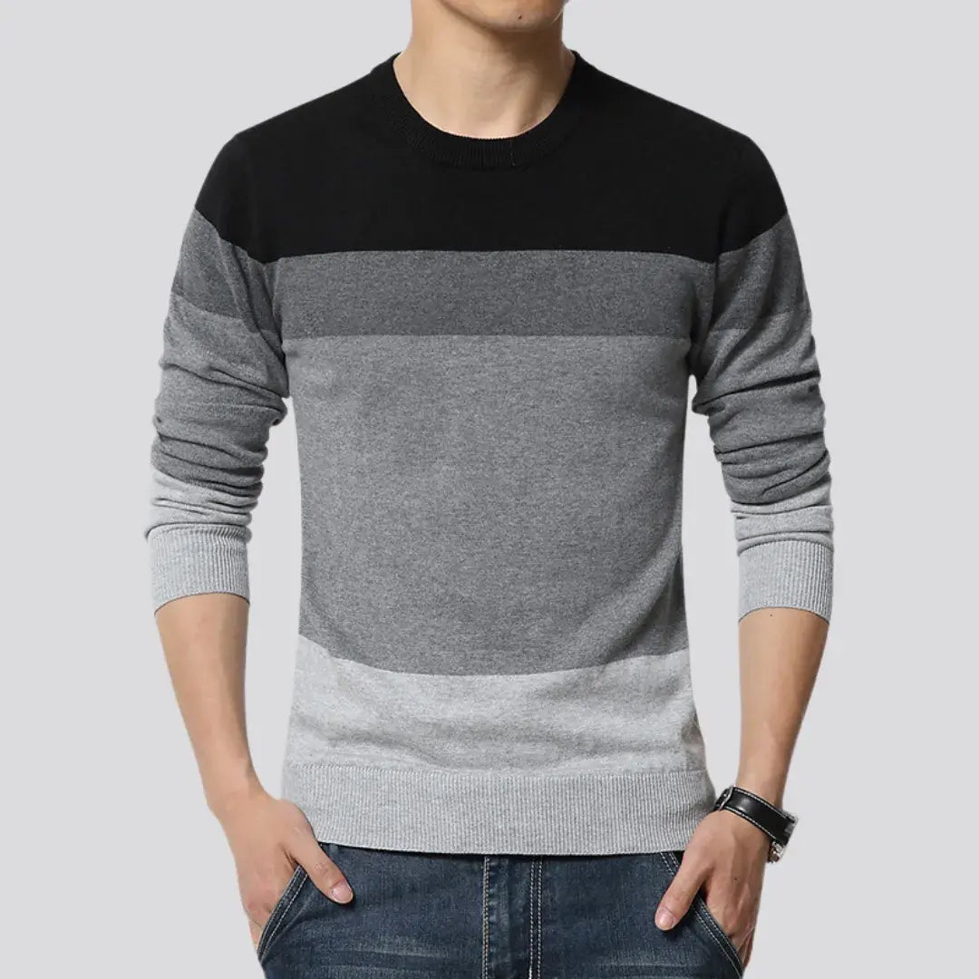 The Jumper - Autumn Stripes is a casual men's sweater perfect for autumn. Made from fine knit cotton, it features an O-neck design and stylish striped pattern. Its soft and comfortable fabric offers a tailored fit, making it ideal for everyday wear or light events.
