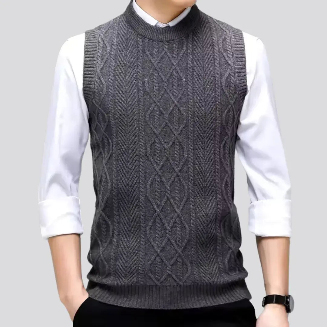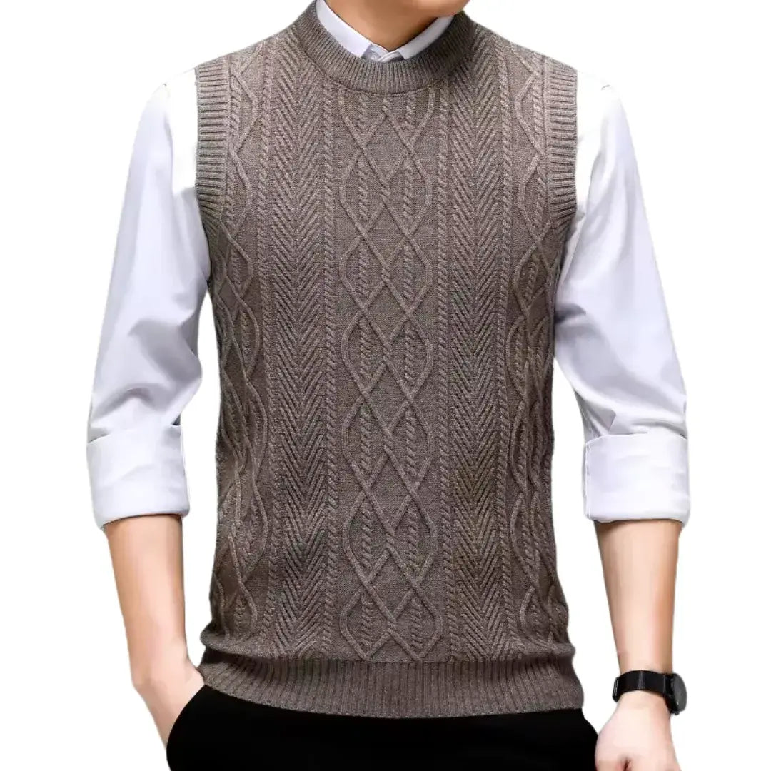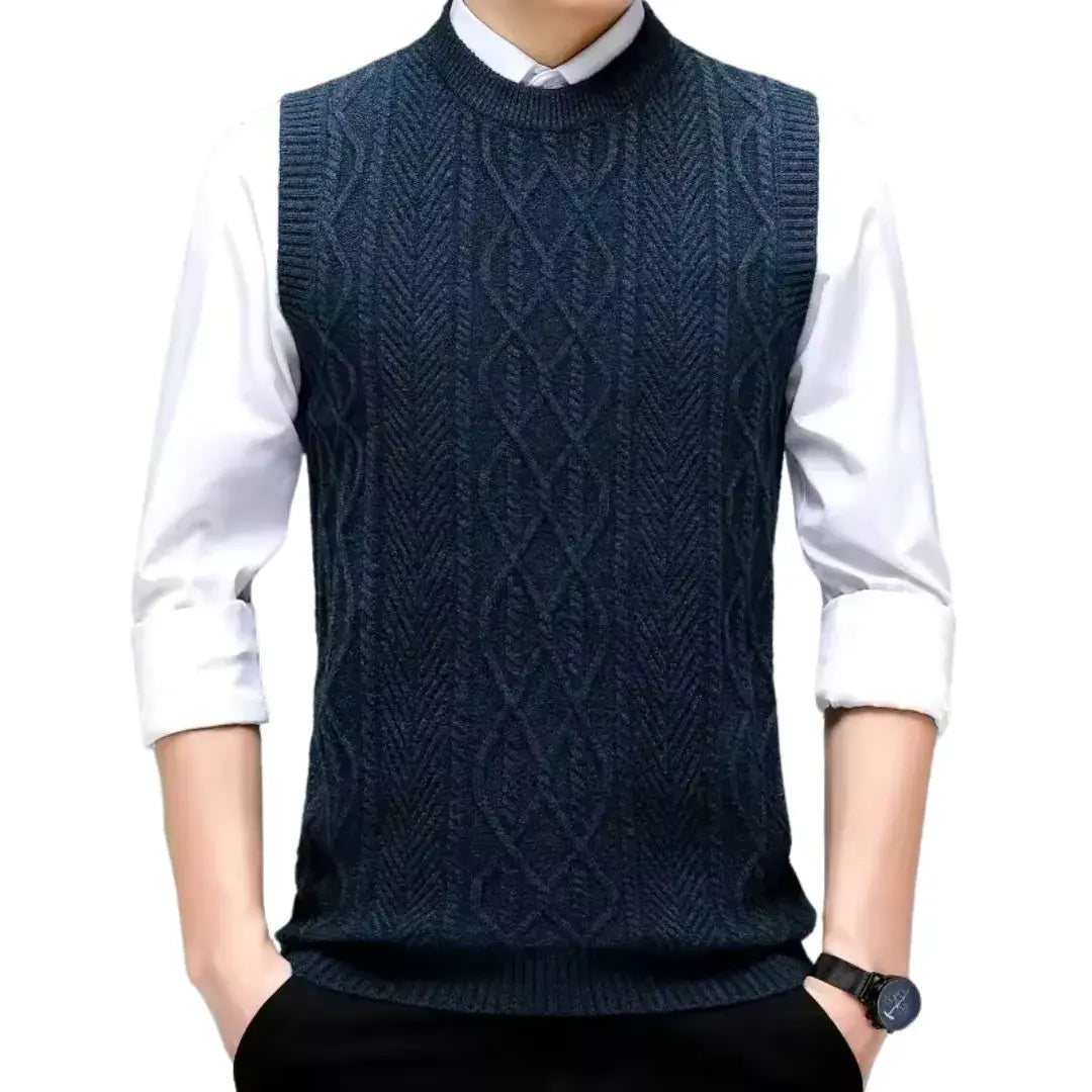 The Sleeveless Jumper - Style Layer is a men's sleeveless knit vest featuring a round neck and jacquard design. With its solid colour and modern style, it combines comfort and practicality, making it ideal for colder days. Perfect for layering over t-shirts or shirts, this versatile piece adds elegance to any outfit.